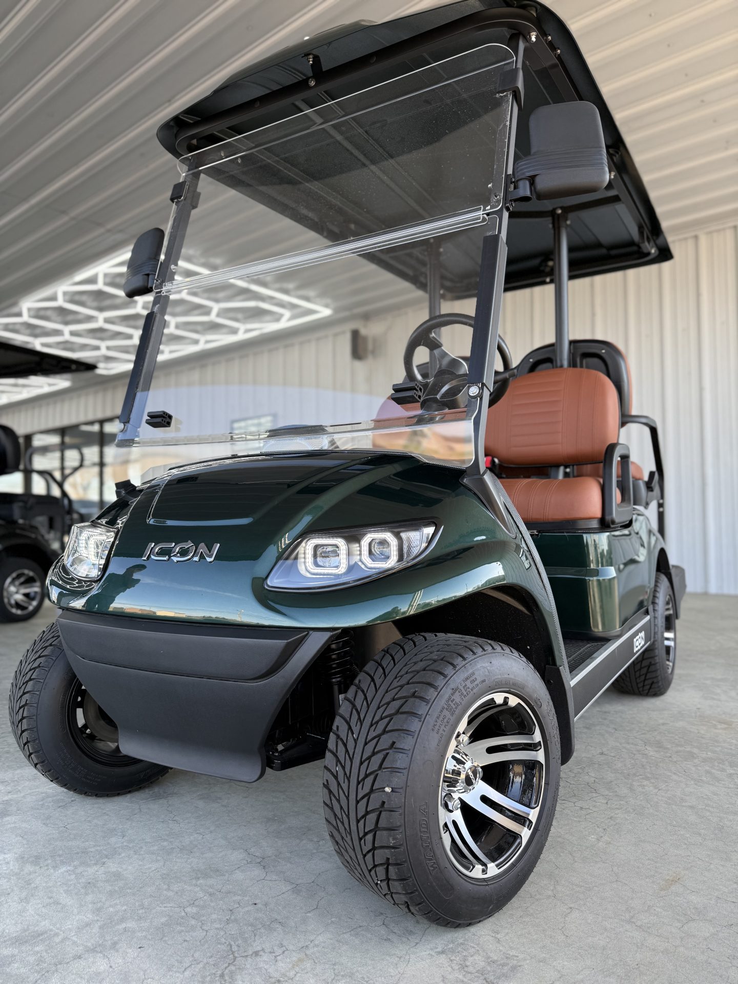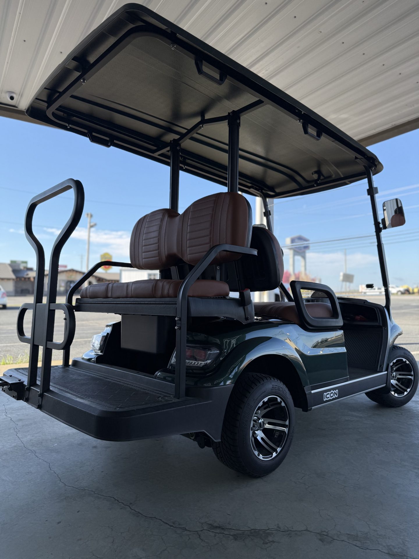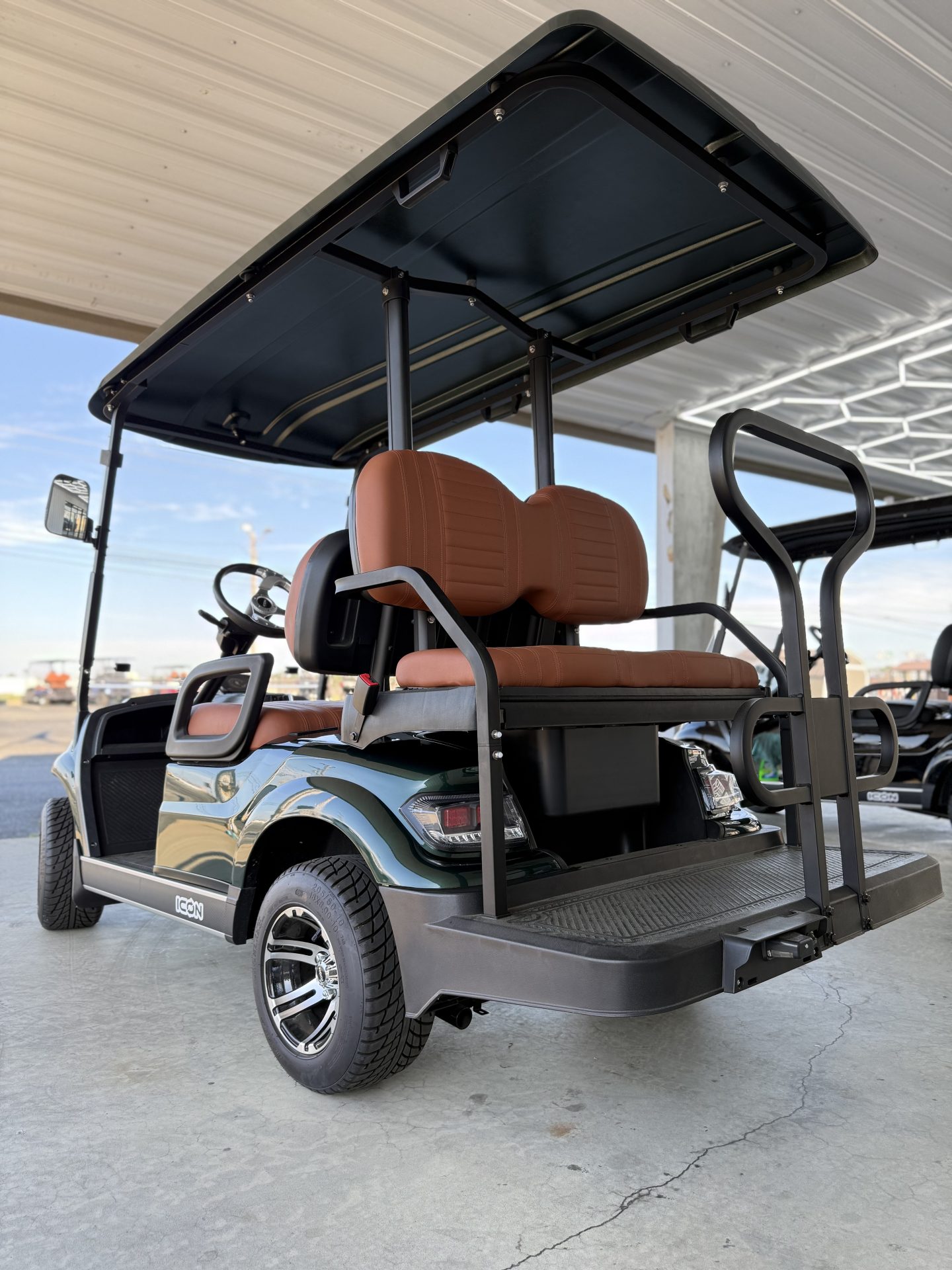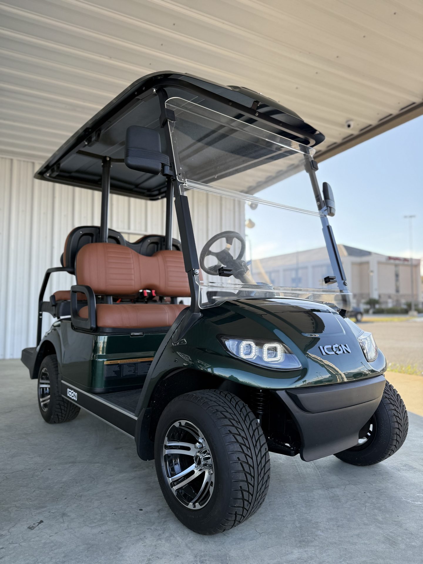 The ICON G40 is a street-legal, 4-passenger gas golf cart powered by a 401cc EFI engine (13.5HP) with speeds of 19–24 MPH and a 150+ mile range. It features 4-wheel disc brakes, independent front suspension, a digital cluster with a backup camera, LED lights, and high-back seating