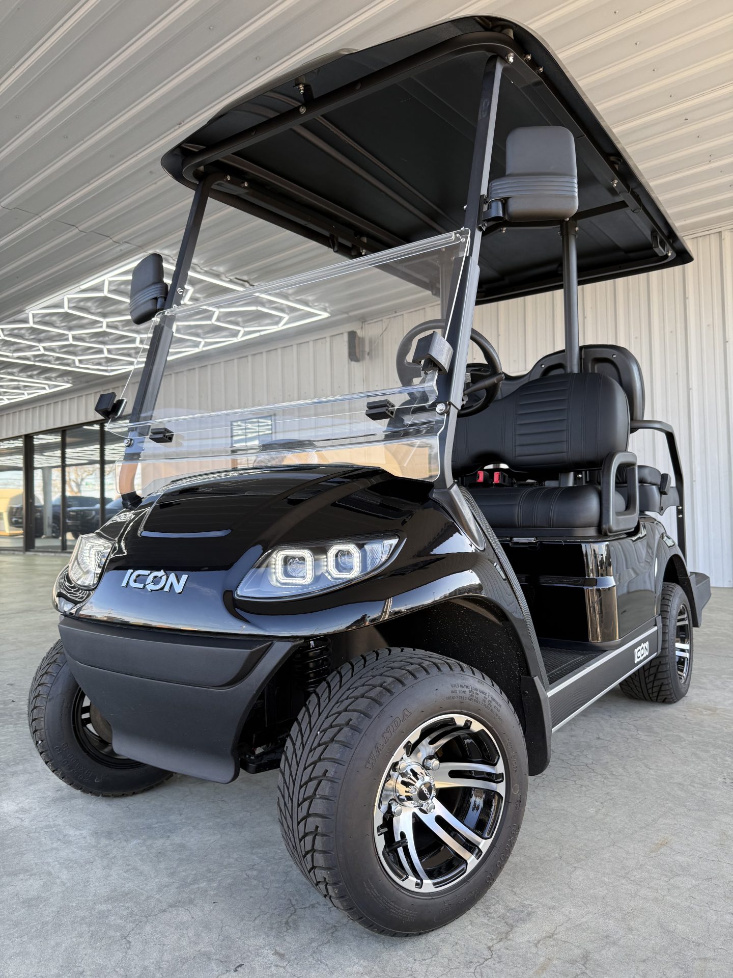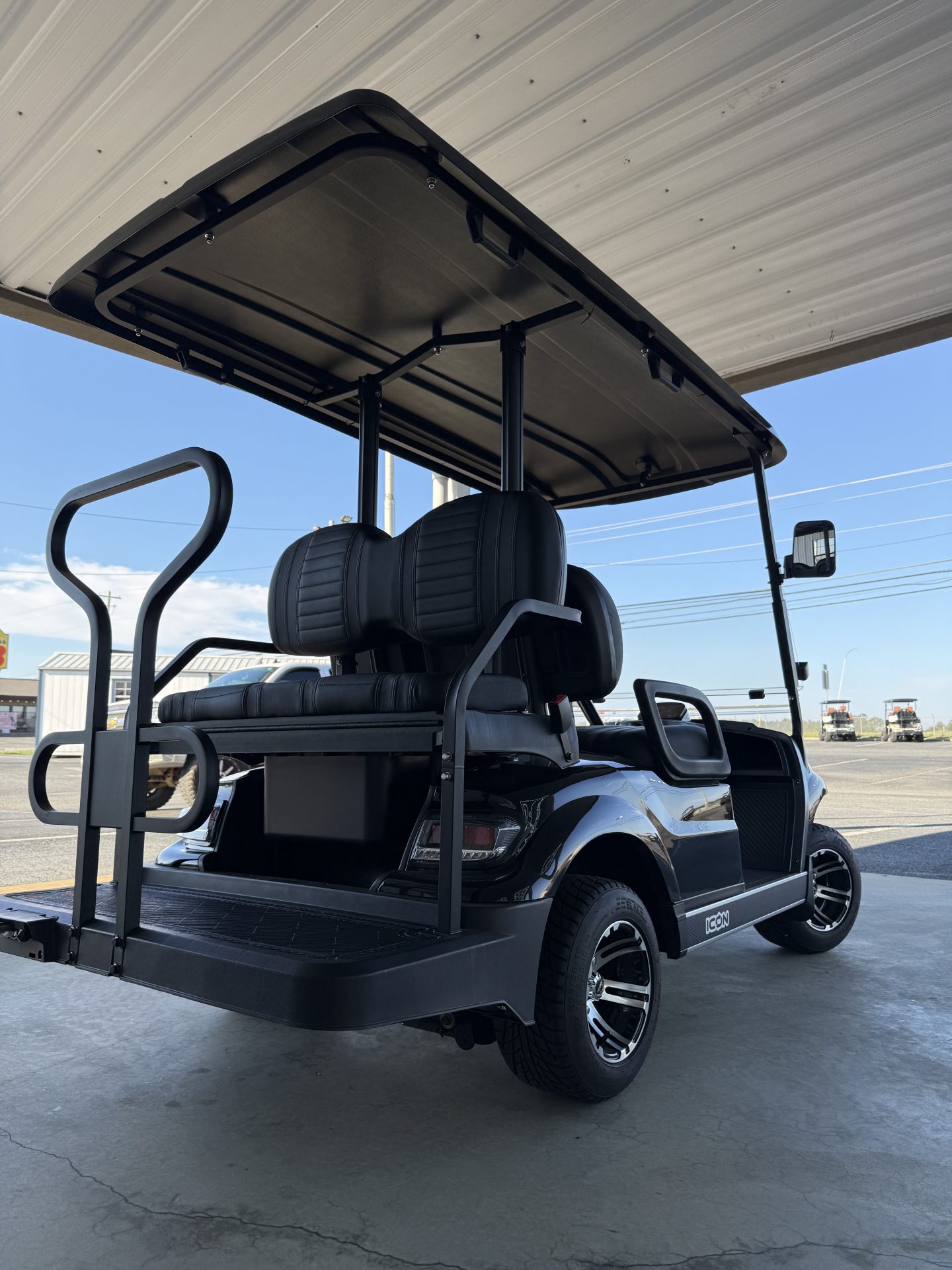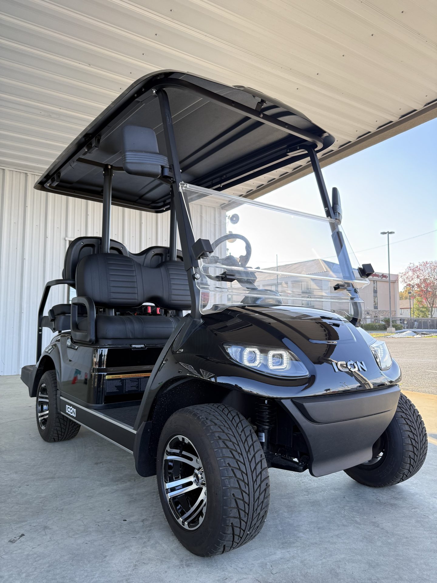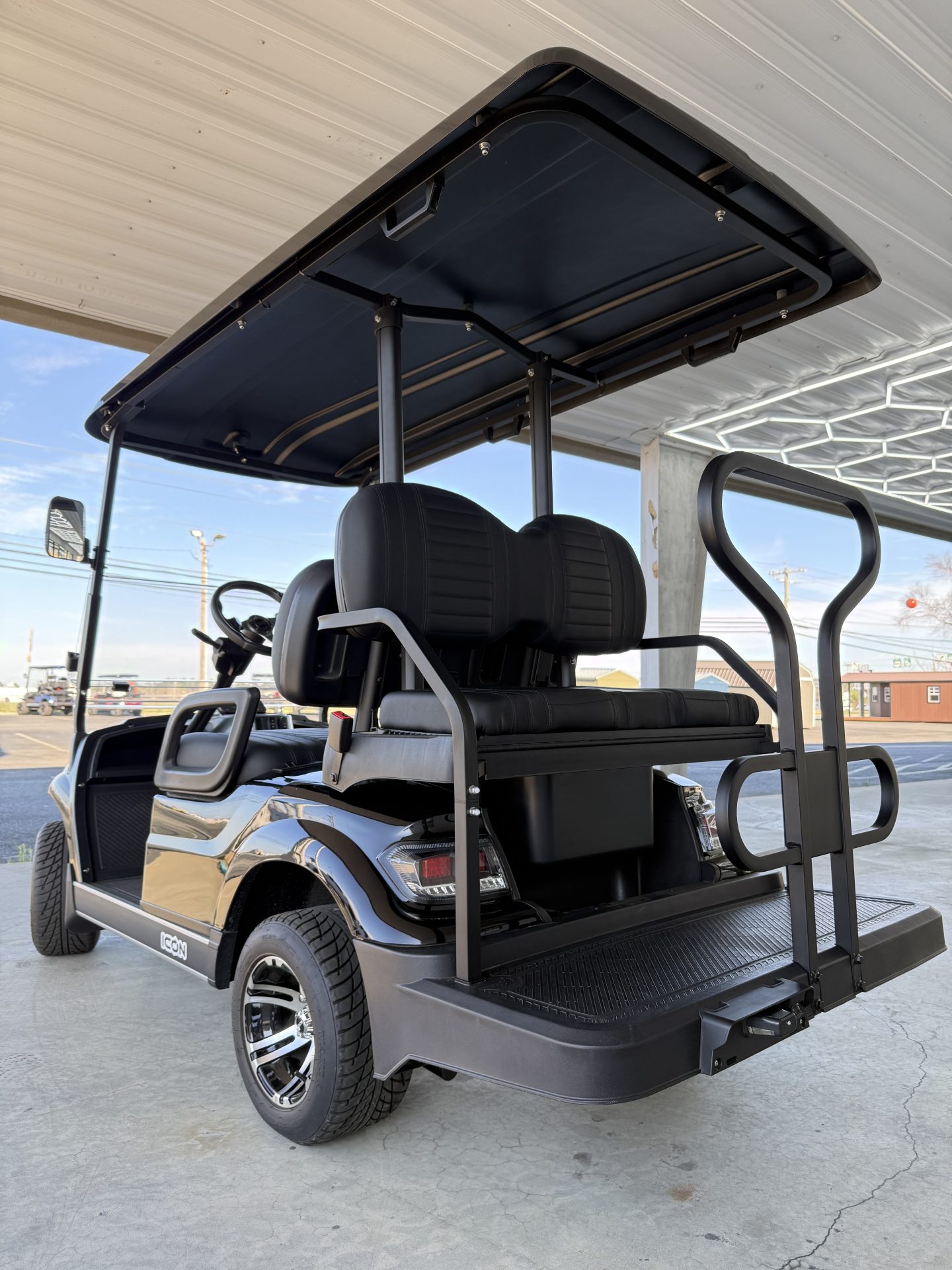 The ICON G40 is a street-legal, 4-passenger gas golf cart powered by a 401cc EFI engine (13.5HP) with speeds of 19–24 MPH and a 150+ mile range. It features 4-wheel disc brakes, independent front suspension, a digital cluster with a backup camera, LED lights, and high-back seating
