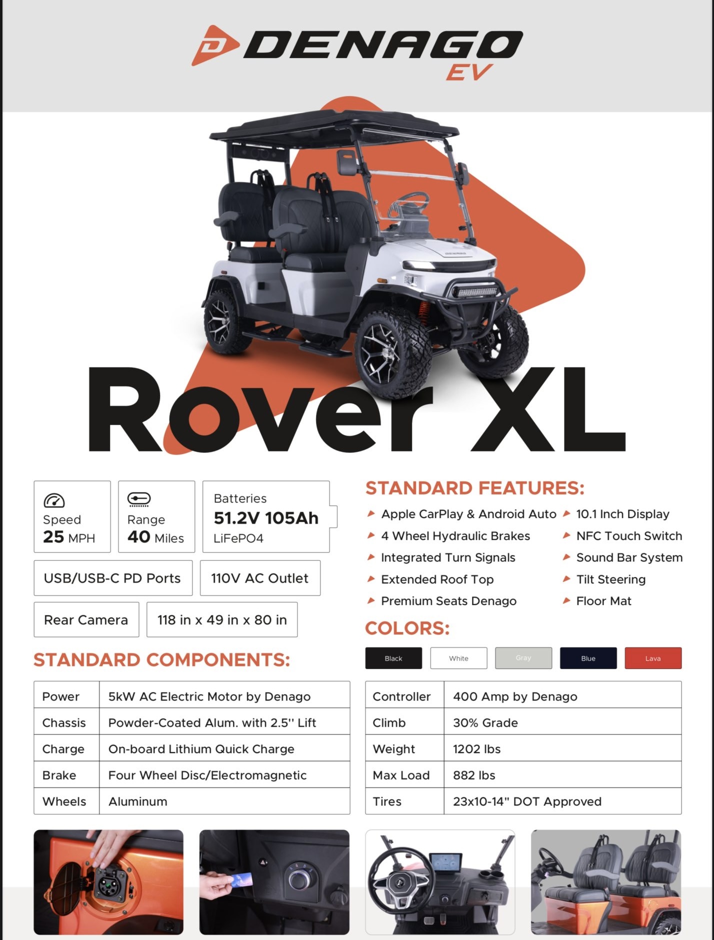 Looking for the ultimate golf cart upgrade? The Denago Rover XL has all the power, comfort, and tech you’ve been waiting for – now with 0% financing for 36 months, NO money down!