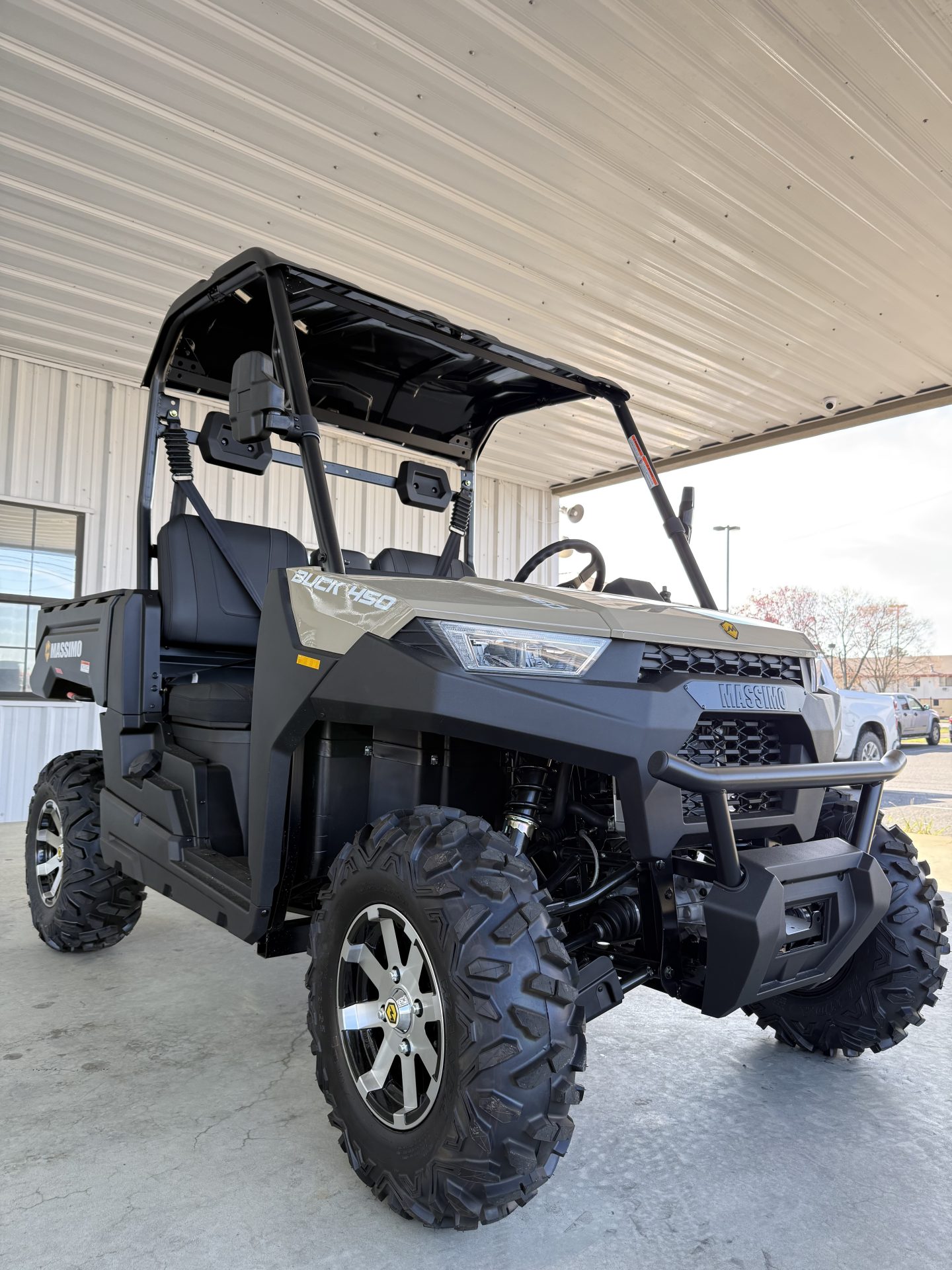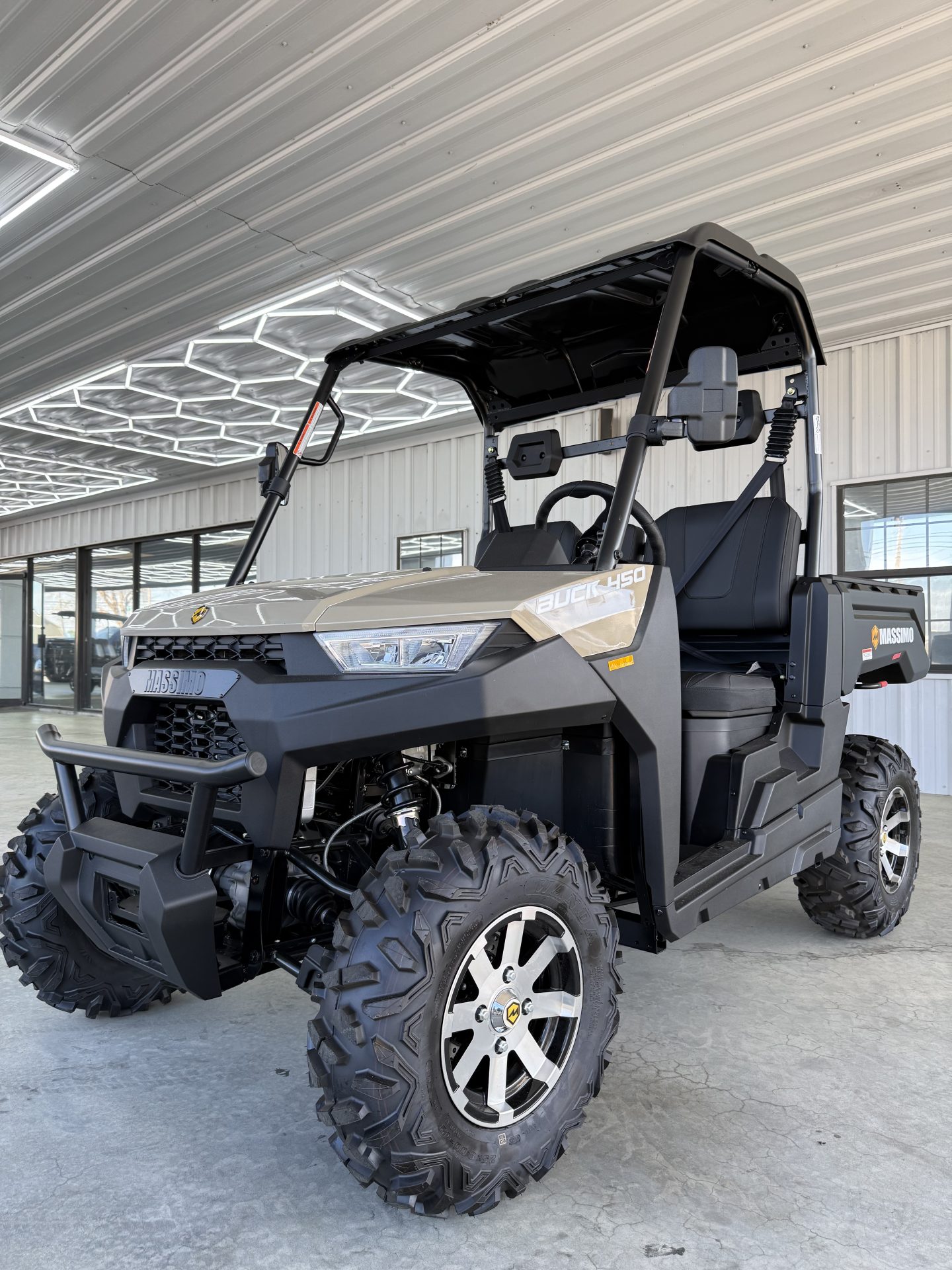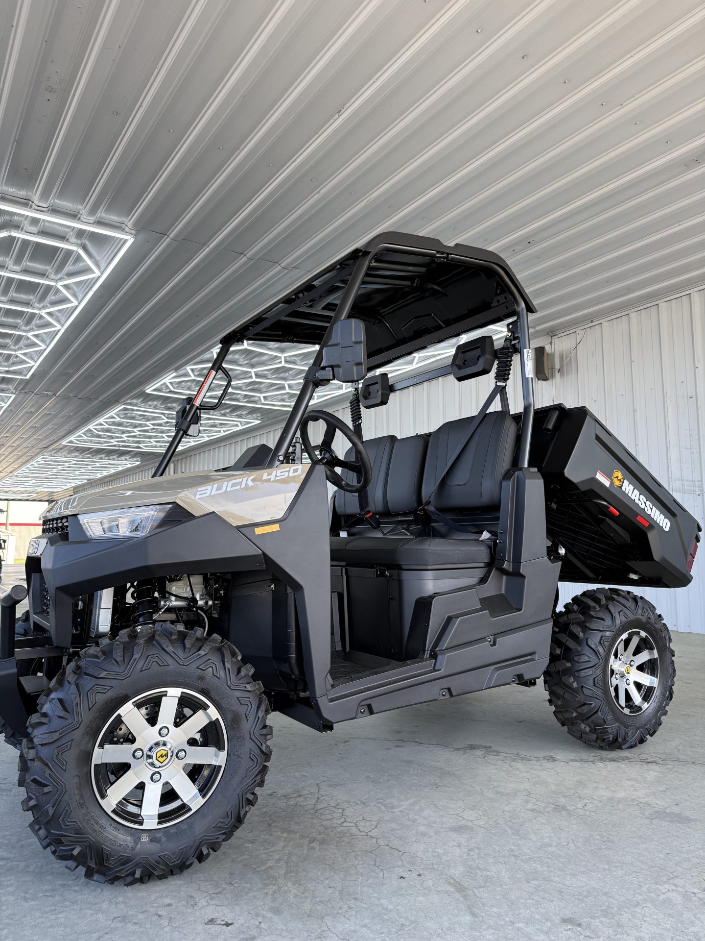 The Massimo Buck 450 is a versatile, compact 4WD utility vehicle (UTV) designed for farm, ranch, and trail use, featuring a 352cc EFI engine that produces 25 HP. It offers a 36-42 mph top speed, and 11-inch ground clearance.